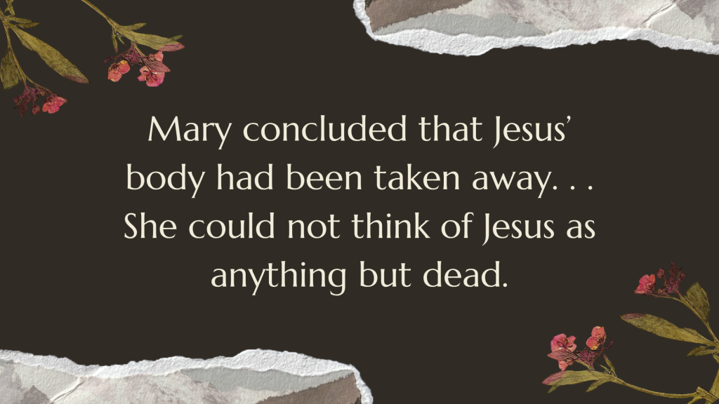 She concluded that Jesus’ body had been taken away and laid elsewhere. In that moment she could not think of Jesus as anything but dead. She had watched Him die. She had seen Him placed in this tomb.