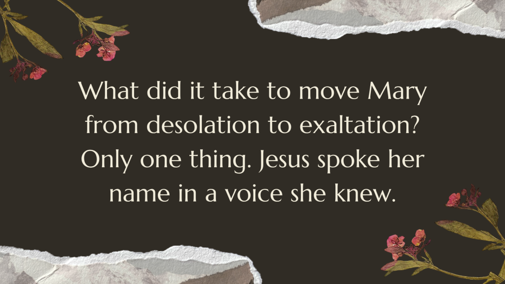 What did it take to move Mary from desolation to exaltation and to galvanize her for witness? Only one thing. Jesus spoke her name in a voice she knew, and it was enough.