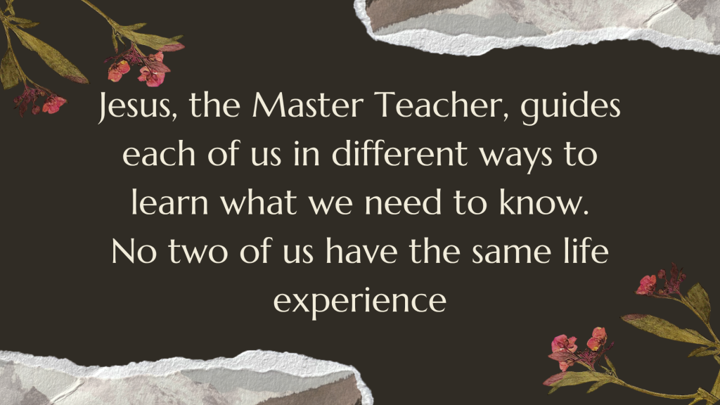 Jesus, the Master Teacher, guides each of us in different ways to learn what we need to know. No two of us have the same life experience. He takes us where we are and works with us there, but always to the same purpose. He wants to move us from ignorance of God to acquaintance to a deep relationship as His daughters and sons. He moves us from no faith to faith to an unshakable confidence in the living God.He teaches us to see tough times as God’s way of moving us to new ways of thinking about ourselves and our purpose in life.We walk with God each day as learners so that we can distinguish good from evil. We go on to maturity.
